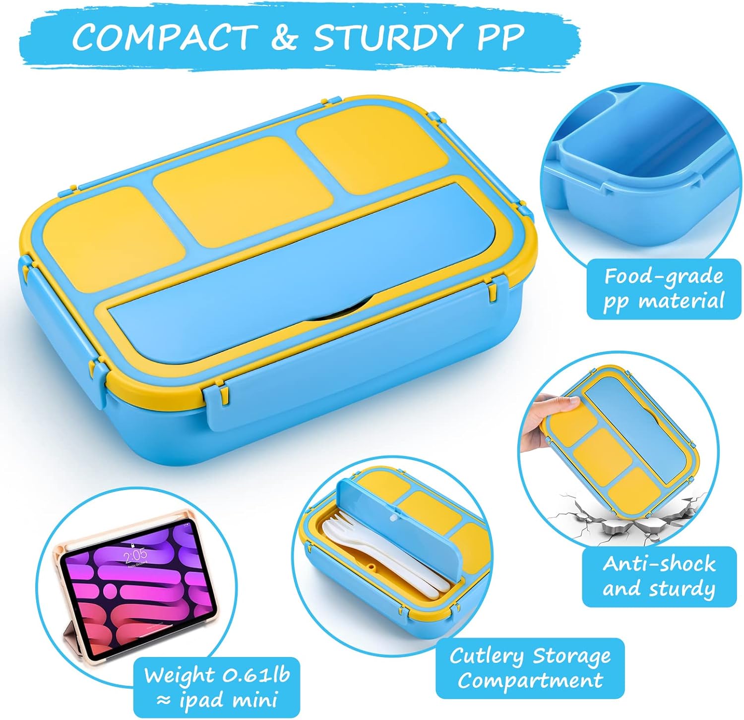 Lonchera Bento para niños y niñas, con 4 compartimentos, recipiente para salsa, utensilios, palillos de comida.