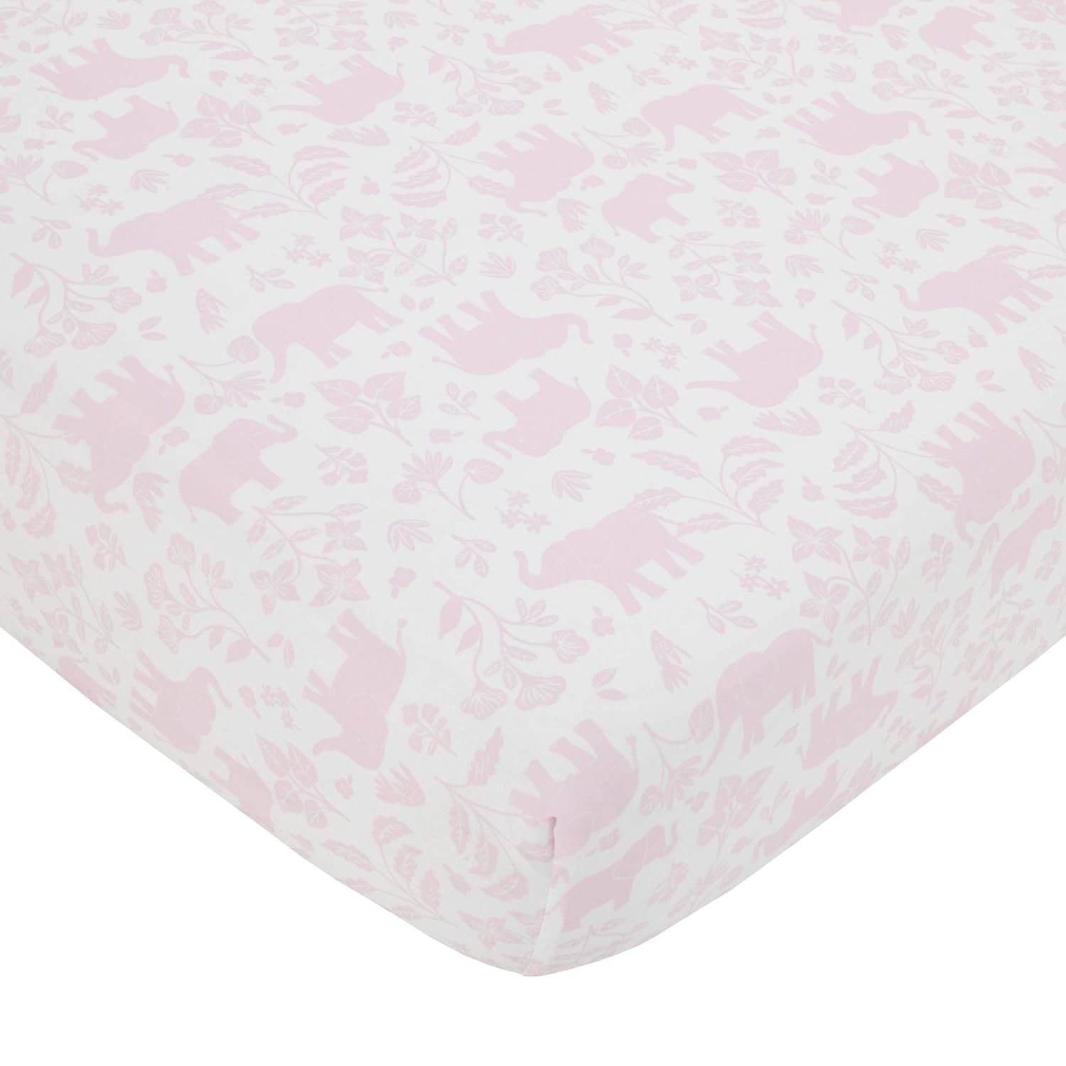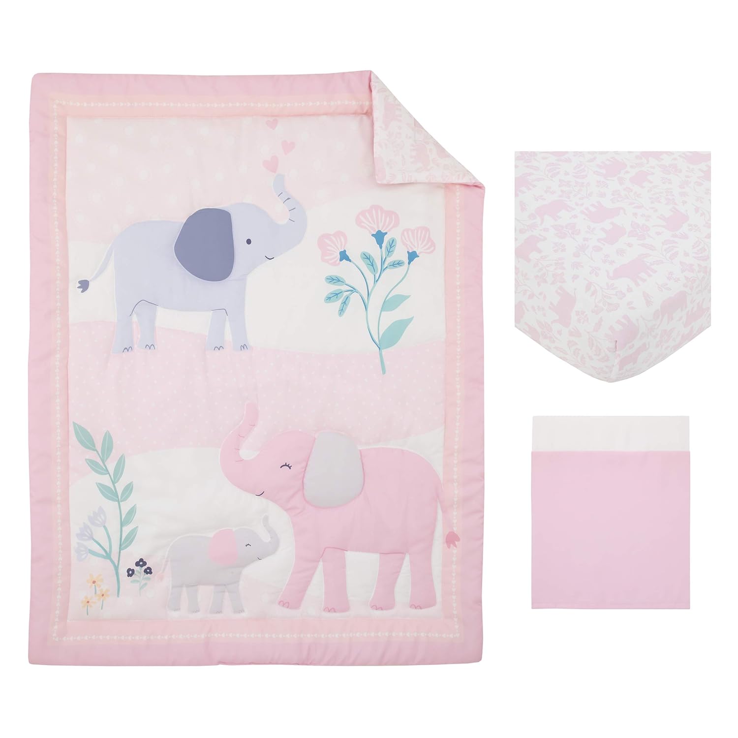 El juego de ropa de cama para cuna de 3 piezas con elefantes florales Sweet de Carter´s incluye un edredón, una sábana ajustable para cuna y un faldón para cuna.