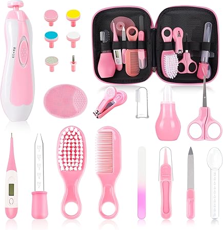 SET DE CUIDADO PARA BEBÉS 21 EN 1: El set de cuidado para bebés incluye cortaúñas eléctrico, limas de uñas, peine, cepillo, cepillo de silicona, cortaúñas, pinzas, gotero, cuchara medidora, aspirador nasal, tijeras, cepillo de dientes, etc. Cada producto es muy práctico. Todos los productos están cuidadosamente preparados para satisfacer las necesidades diarias de los recién nacidos.