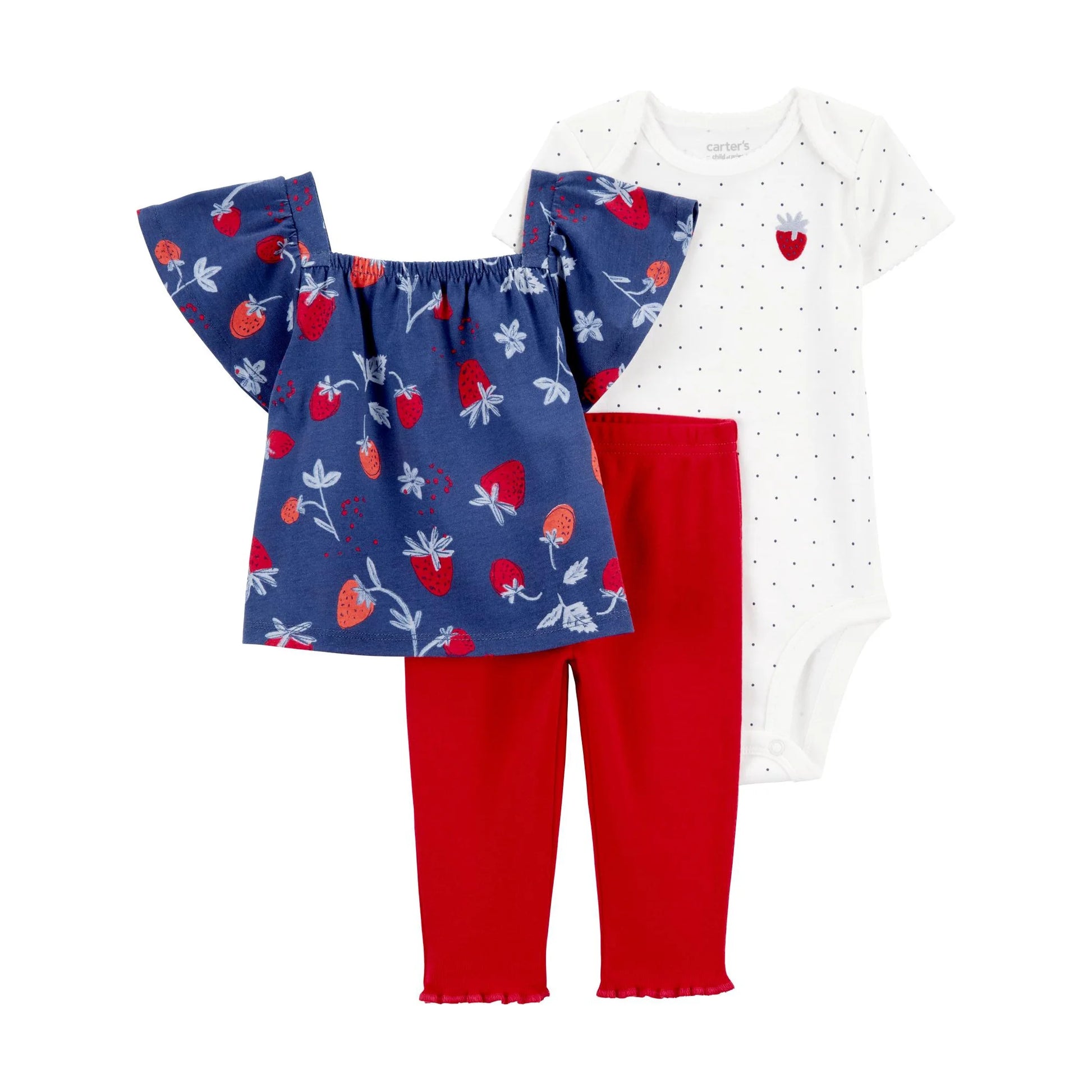 Pants rojo, camisa azul diseño fresitas y body blanco puntos